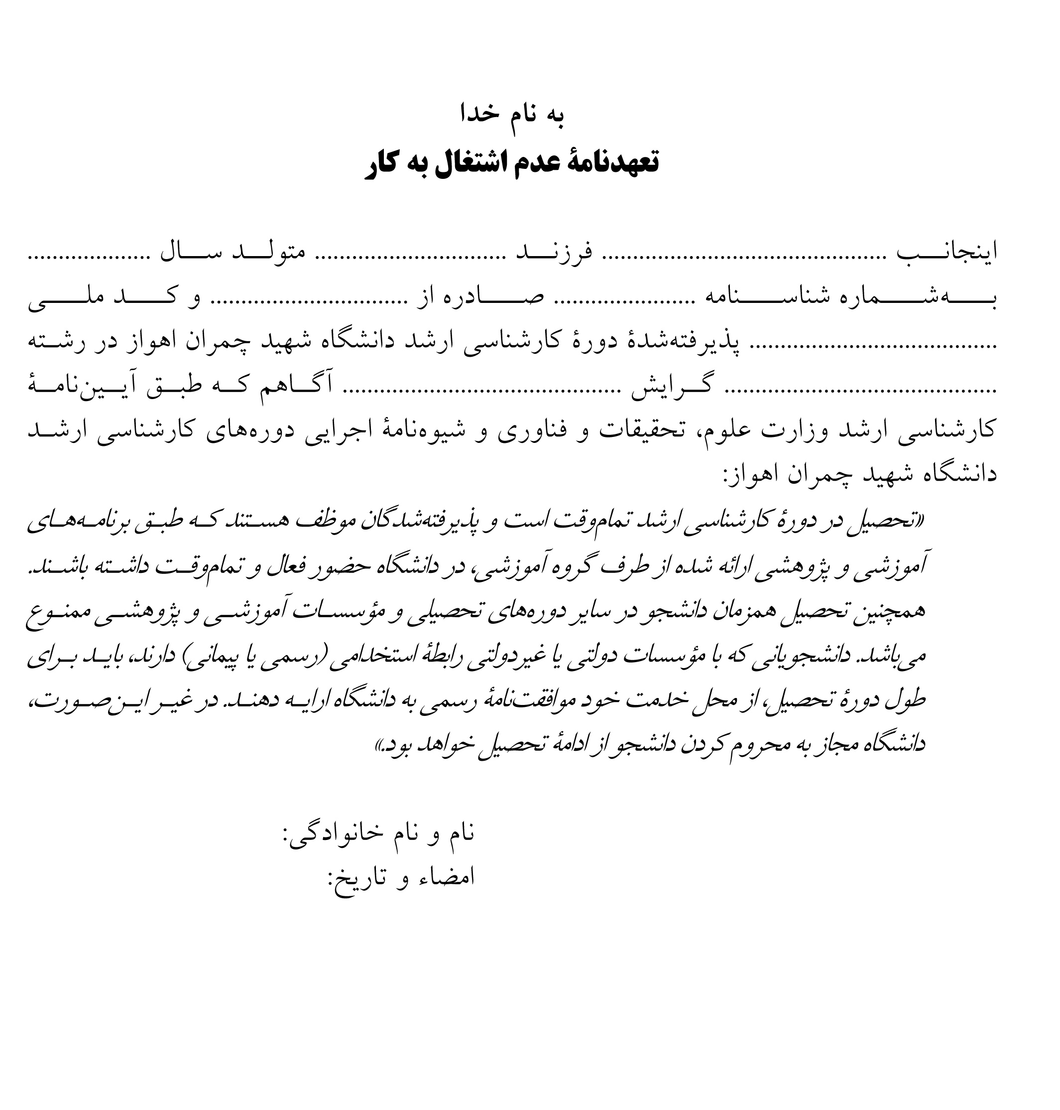 فرم تعهد عدم اشتغال